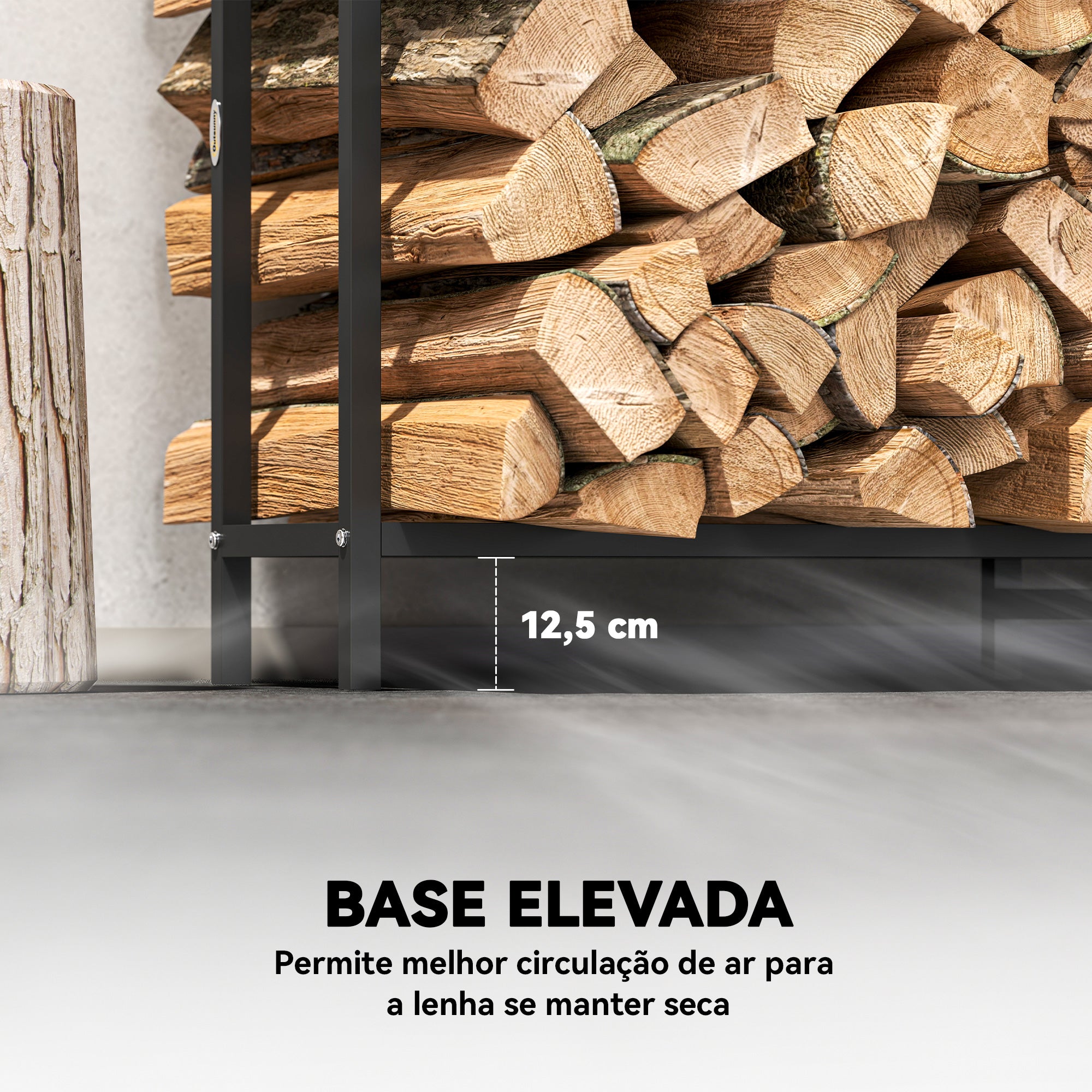 - Este suporte para lenha de exterior mede 199x30x121 cm e permite armazenar grandes quantidades de madeira de forma organizada graças à sua capacidade de até 300 kg Conta com uma estrutura de aço com revestimento em pó resistente à corrosão, ideal para usar tanto em interiores como em exteriores O suporte para troncos incorpora quatro pés de reforço adicionais que garantem grande estabilidade mesmo com cargas elevadas A base elevada a 12,5 cm do chão favorece a ventilação e ajuda a manter a lenha seca e pronta para uso imediato Este organizador para lenha de jardim é fácil de montar em apenas 30 minutos com ajuda de outra pessoa, graças à sua estrutura simples e instruções claras O acabamento preto clássico combina facilmente com diferentes estilos decorativos em jardins, terraços ou espaços interiores O suporte para lenha inclui um elegante design recortado em forma de fogueira nas laterais, que confere um toque decorativo distinto