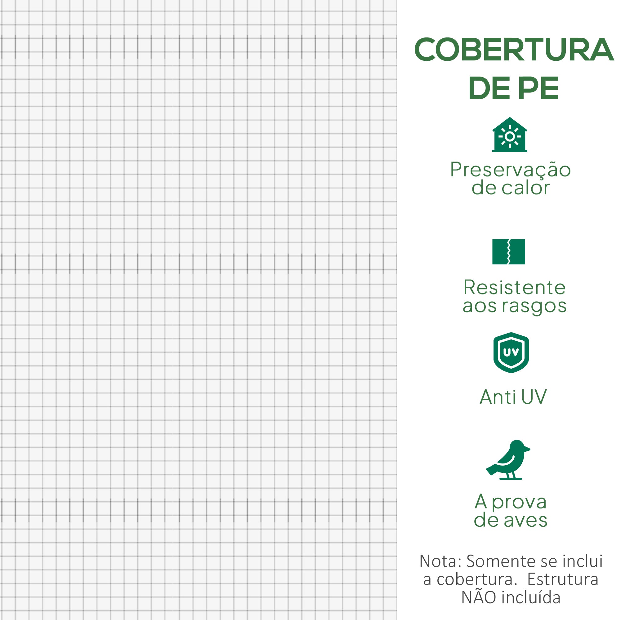 - COBERTURA RESISTENTE: Cobertura para estufa fabricada em PE. Possui janelas e tem propriedades anti·UV e anti·envelhecimento, para lhe proporcionar uma utilização prolongada que lhe permite proteger as suas plantas do frio, da chuva, do vento e da neve durante muito tempo. Esta cobertura possui fitas de fixação, para que possa ser facilmente instalada na estrutura da sua estufa