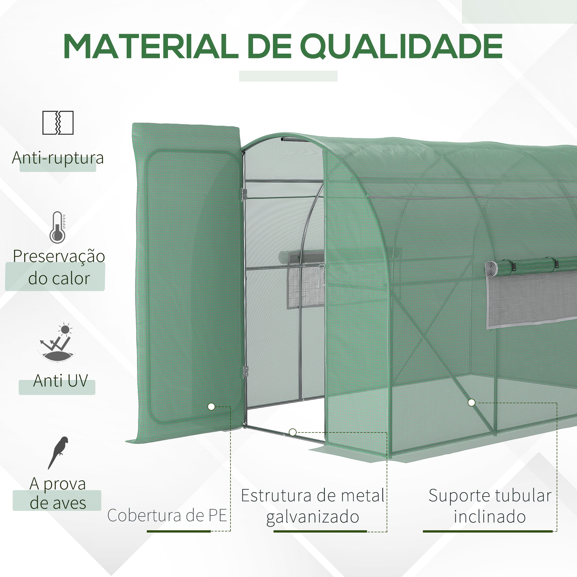 - Ampla estufa tipo túnel com estrutura metálica e cobertura em polietileno Cobertura translúcida anti-UV para aproveitar a luz solar para que as suas plantas possam fazer o seu trabalho Boa preservação do calor e isolamento térmico, adequado para flores, vegetais e frutas Com 1 janela de malha de cada lado, com tampa de enrolar para uma boa ventilação Porta com estrutura metálica para facilitar o acesso Com reforço e travessas de apoio para maior estabilidade Com bordas estendidas de 20 cm, que devem estar bem enterradas no solo Requer montagem