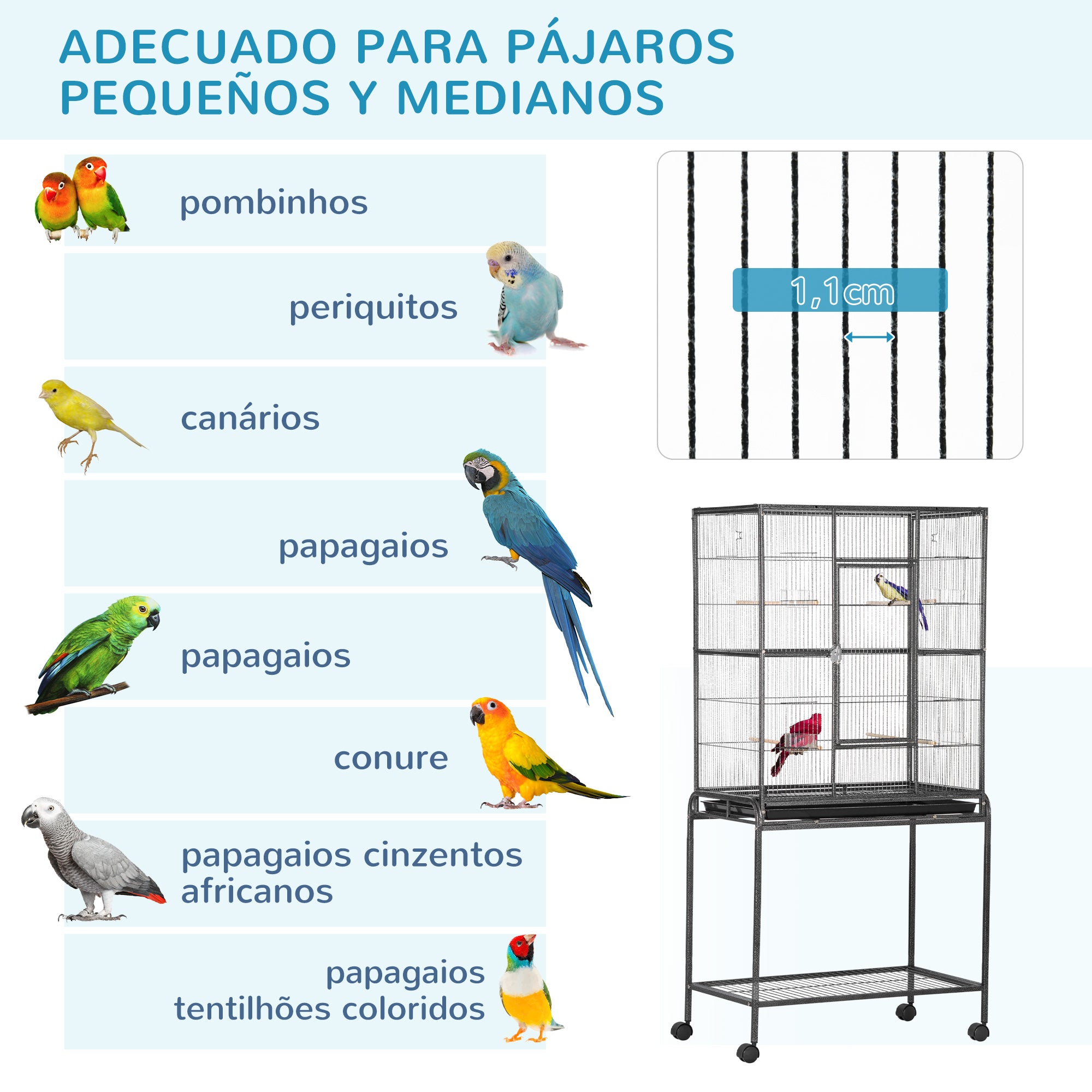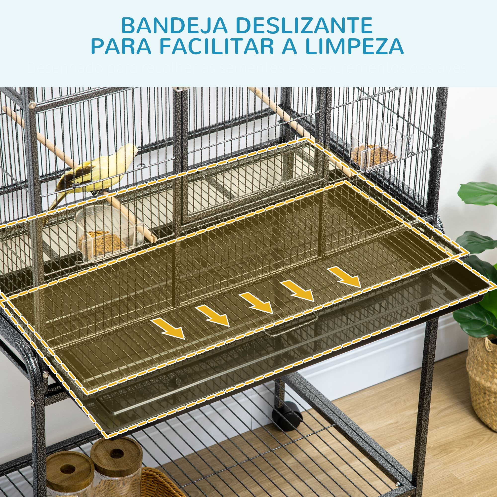 - Esta gaiola da PawHut, ideal para pássaros de pequeno a médio porte Possui estrutura robusta fabricada de metal, fio de aço e plástico Possui portas grandes de fácil acesso, cabides de madeira, recipientes para alimentos e bandeja deslizante para limpeza É removível para facilitar o transporte e possui rodas para facilitar sua movimentação Inclui uma prateleira inferior para guardar suprimentos para animais de estimação Requer montagem