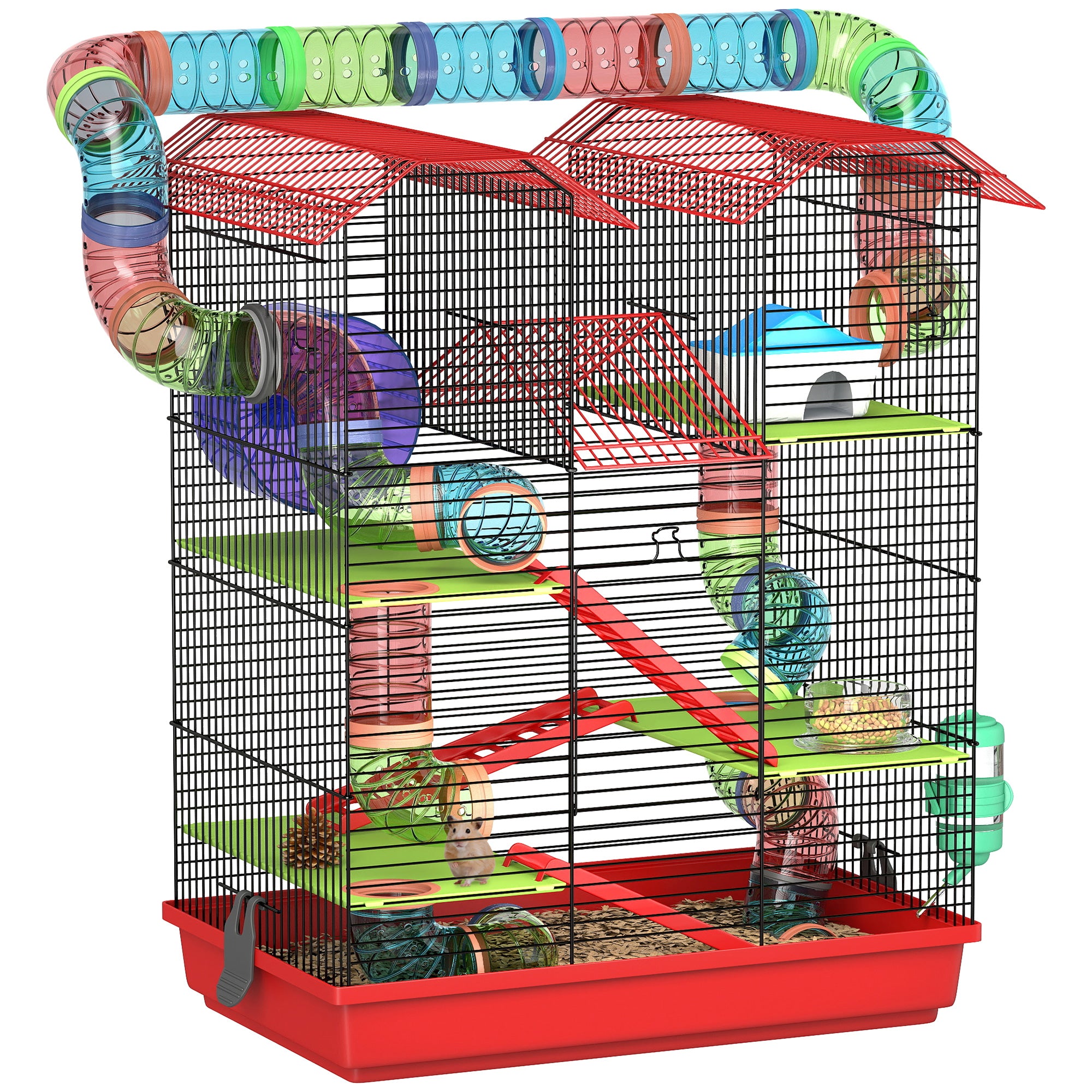 Gaiola para Hamster de 5 Níveis 47x30x59 cm Casa para Animais Pequenos com Túneis Tigela Bebedouro Casinha Roda de Exercício Rampas para Hamsters e Gerbos Vermelho