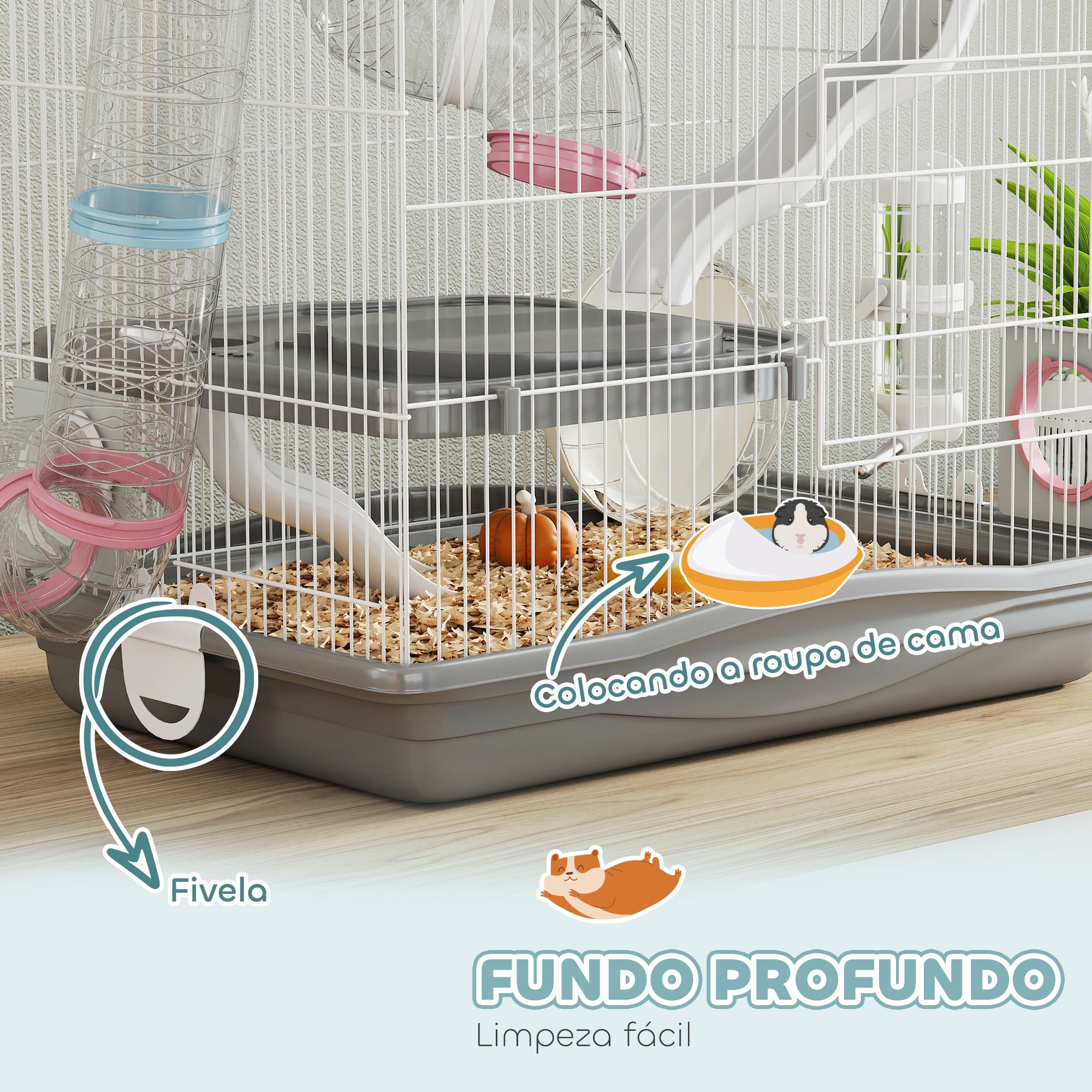 Gaiola para Hamster 45x30x45 cm Casa para Animais Pequenos com Túnel Plataformas Taça Bebedouro Casinha Rampas e Roda de Exercício para Hamsters Anões Gerbos Cinzento