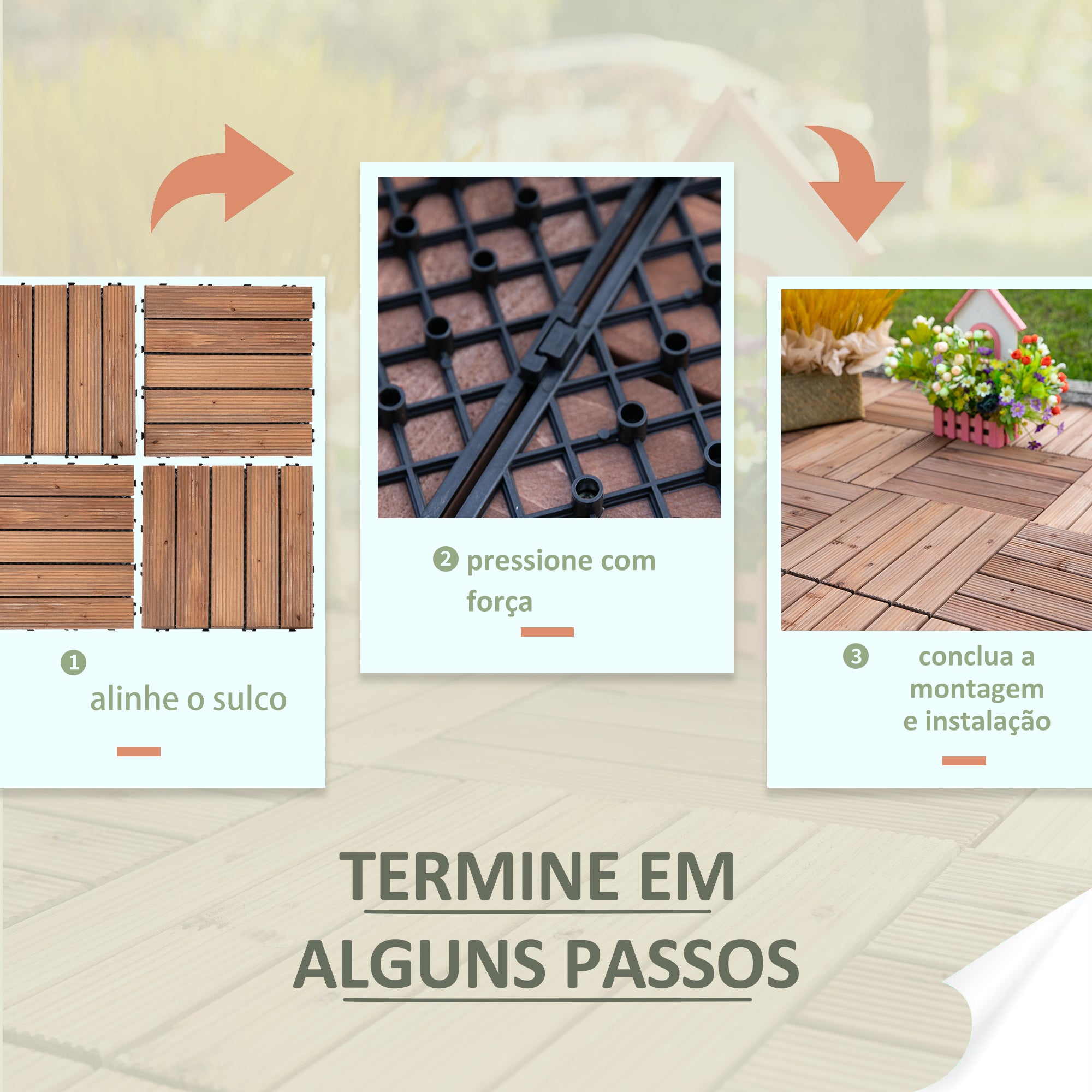 - MEDIDAS TOTAIS: Medidas de uma prateleira: 30x30x2,5 cm (CxLxA); Inclui 27 peças; Área total: 3m² Você precisa revestir uma área do seu terraço ou jardim e não quer recorrer a obras caras? O conjunto de 27 ladrilhos de Outsunny é a solução perfeita para cobrir uma área de 3 metros quadrados. Cada ladrilho mede 30cm de cada lado e pode ser unido com um simples sistema de click. Fabricado em madeira maciça texturizada e ancoragem em PVC, oferece uma superfície antiderrapante para caminhar confortavelmente sobre ela, mesmo quando molhado da chuva ou da água da sua piscina.