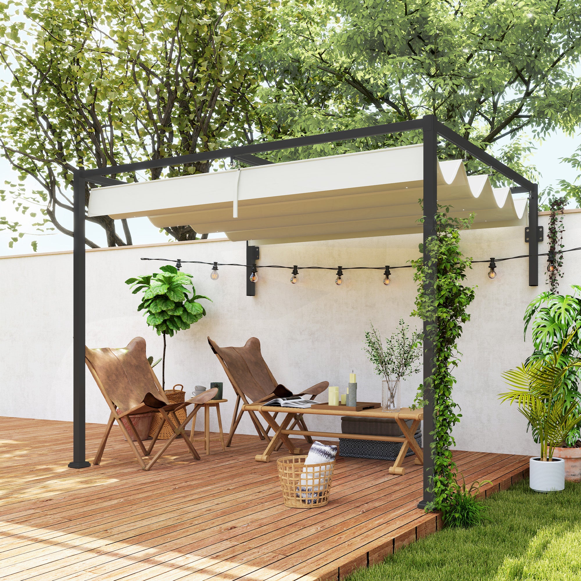 Pérgola de Parede 297x211x220 cm Pérgola de Jardim com Teto Retrátil e Estrutura de Aço Pérgola para Pátio Exterior Creme