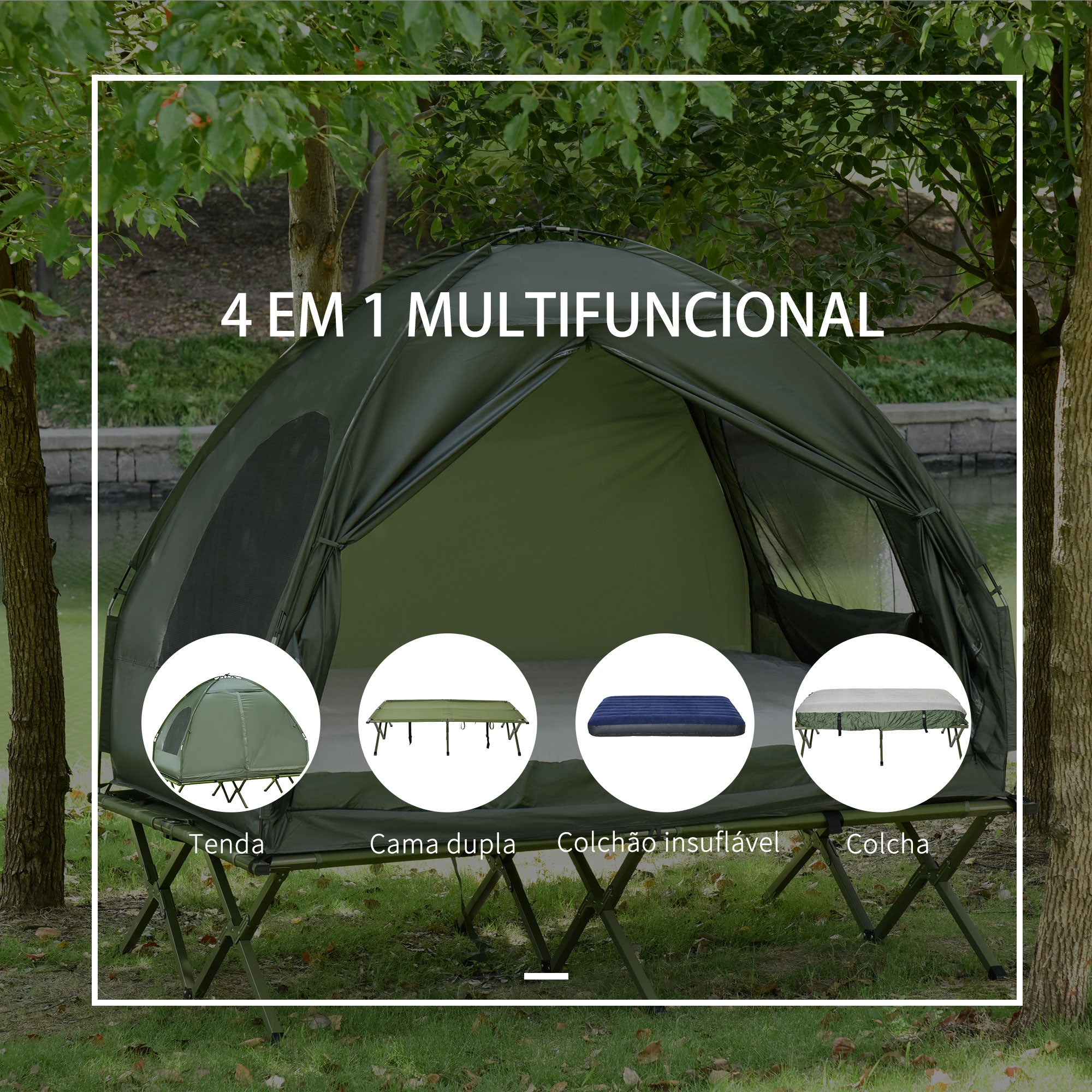 Cama Dupla de Campismo Dobrável com Tenda 2 em 1 Cama de Campismo Elevada com Colchão Inflável e Bolsa de Transporte Tecido Oxford Aço 193x145x180cm Verde