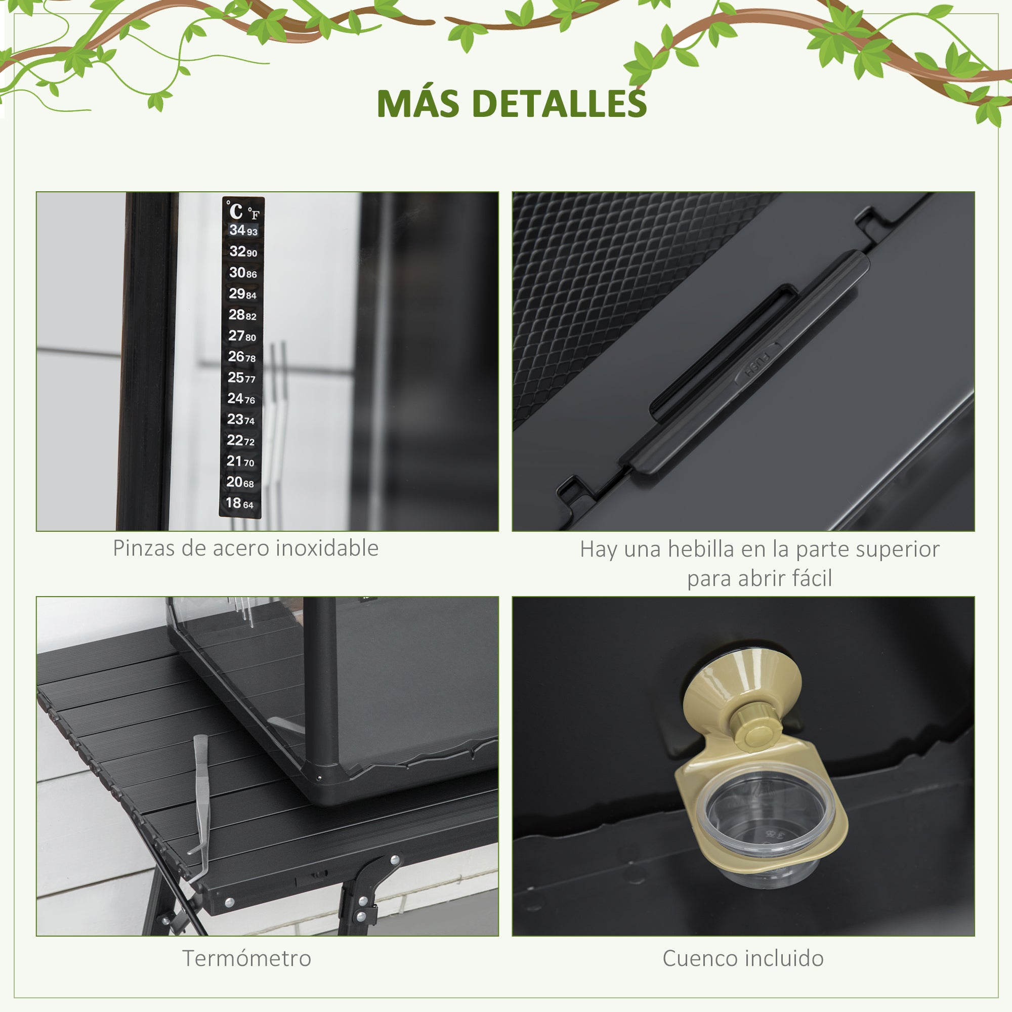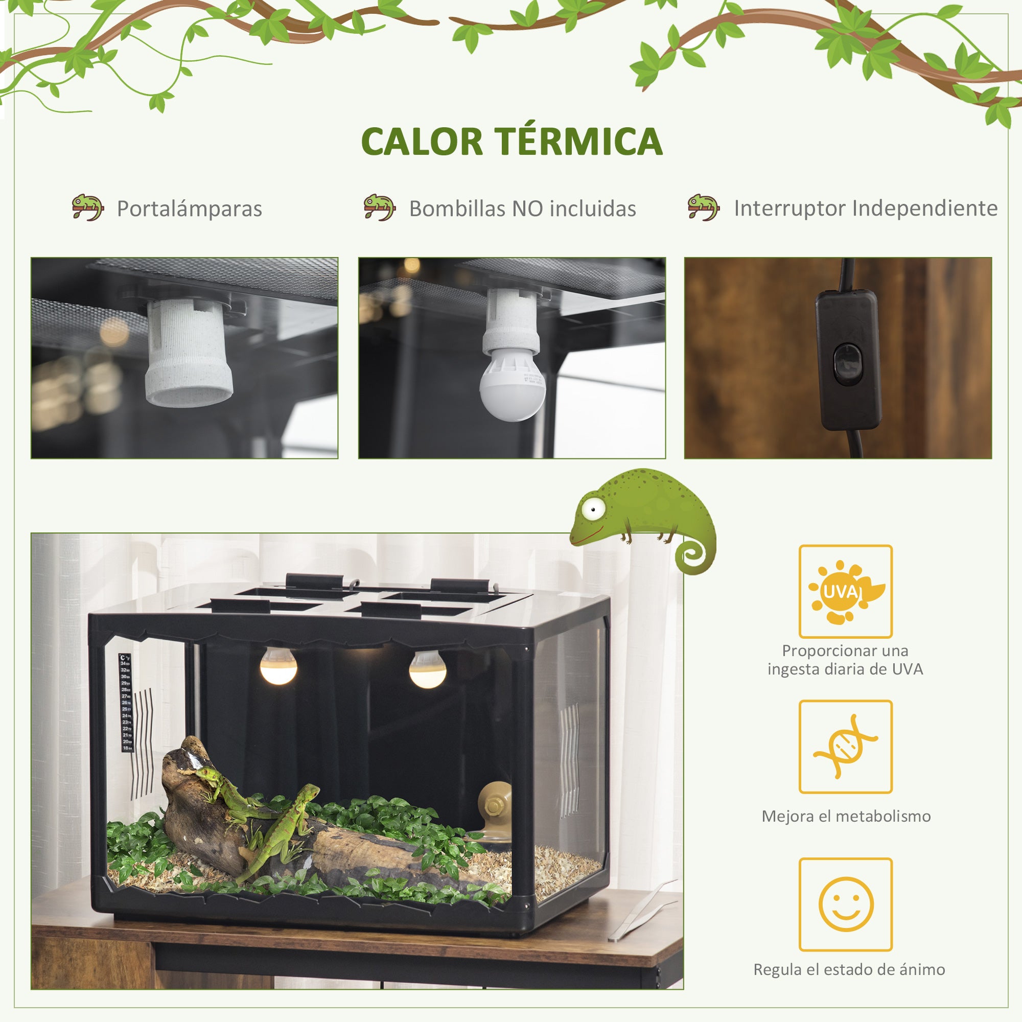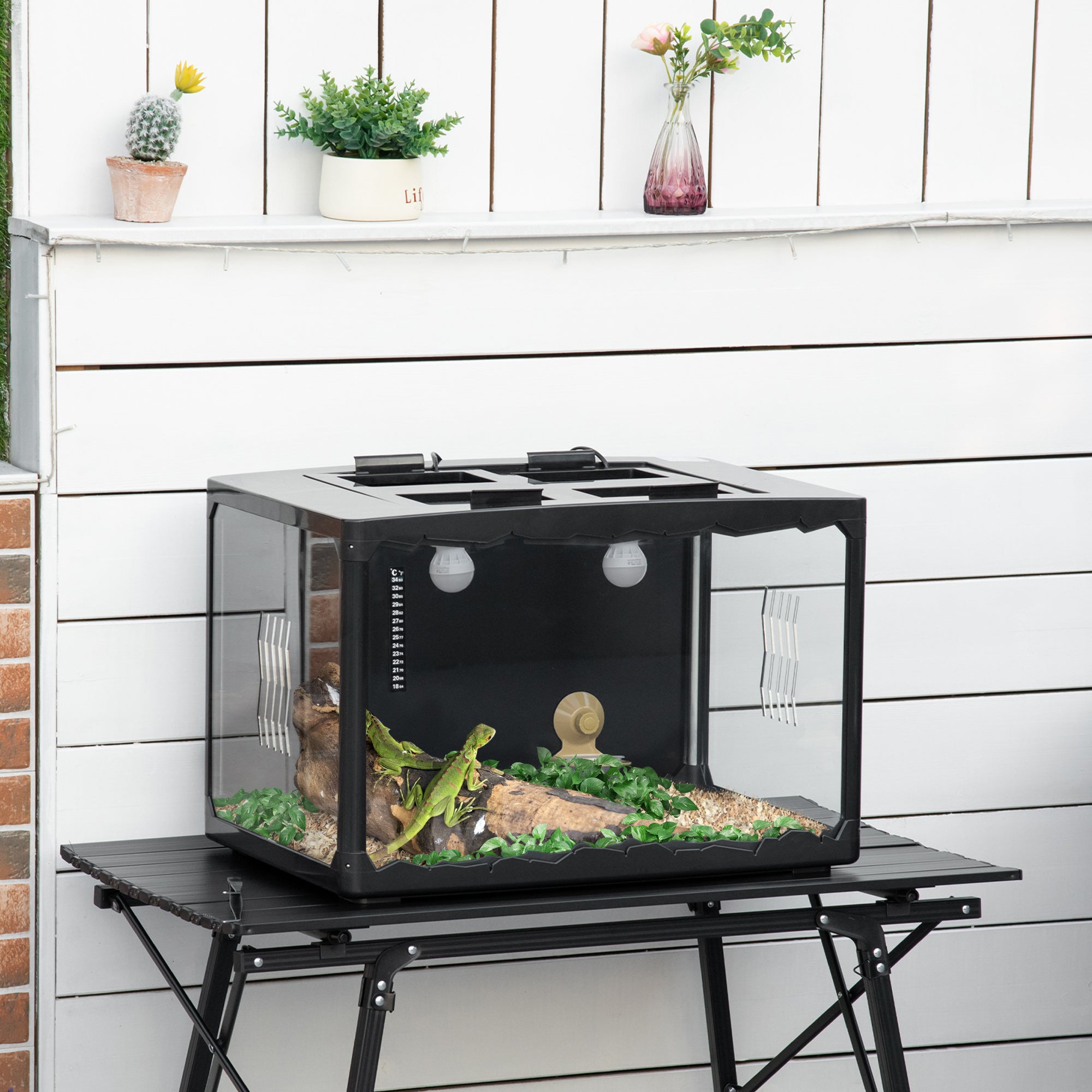 - MEDIDAS TOTAIS: 60x40x40,5 cm (CxLxA). Fácil de usar, sem necessidade de montagem. Adequado para lagartos, camaleões, tartarugas e outros animais. Nota: Répteis e decorações não incluídos Transforme sua casa em um paraíso selvagem com este terrário de PawHut. Projetado para reproduzir ambientes desérticos e tropicais, é equipado com termômetro para controle de temperatura interna, acessórios para inserção de lâmpadas e tigela elevada. Estudado em cada detalhe, possui paredes de vidro com aberturas laterais e uma grade superior de metal que é fácil de abrirmos, mas intransponível para seus répteis.
