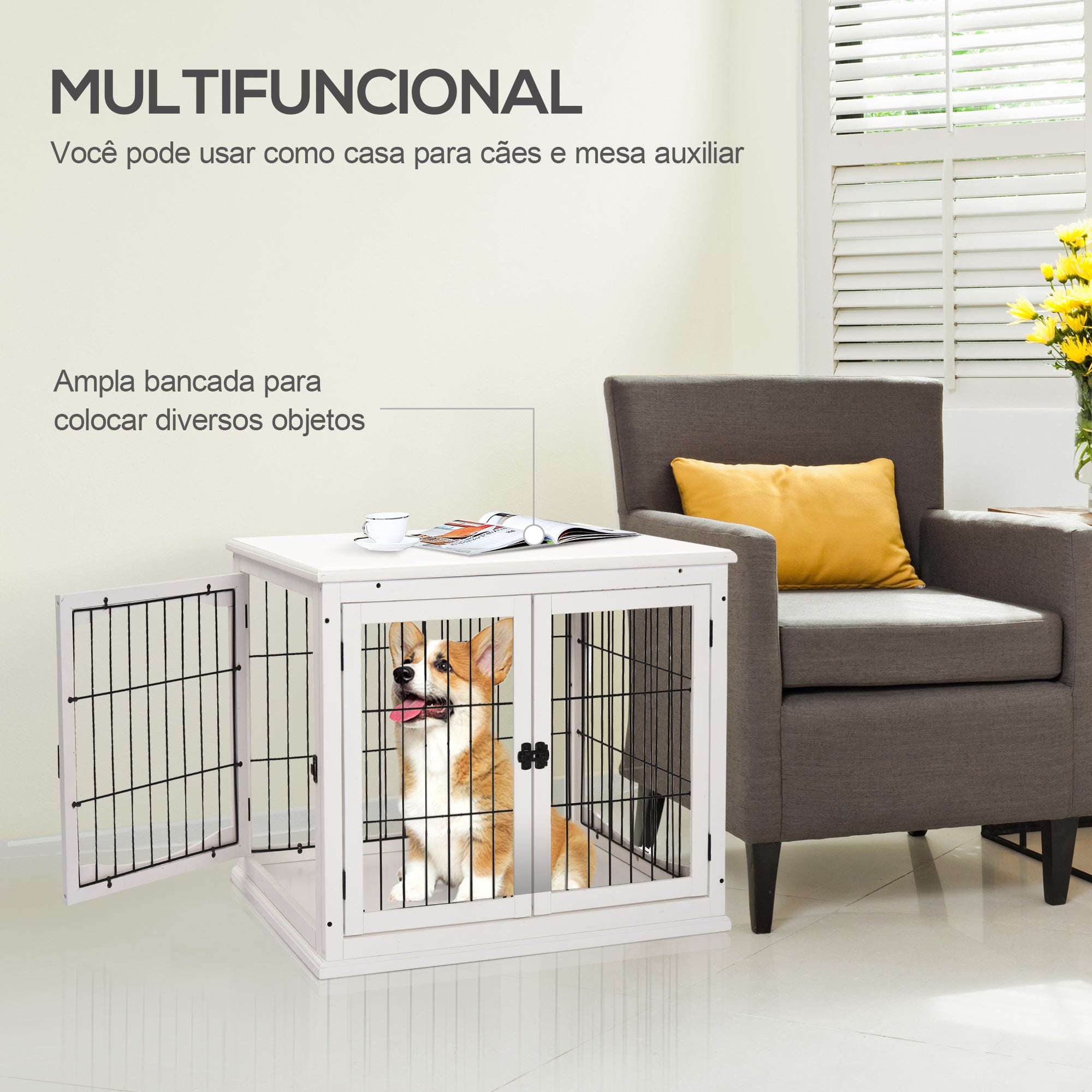 Gaiola para Cães Grande de Madeira com Superfície de Mesa 2 Portas e Grades de Metal 58,5x81x66cm Branco