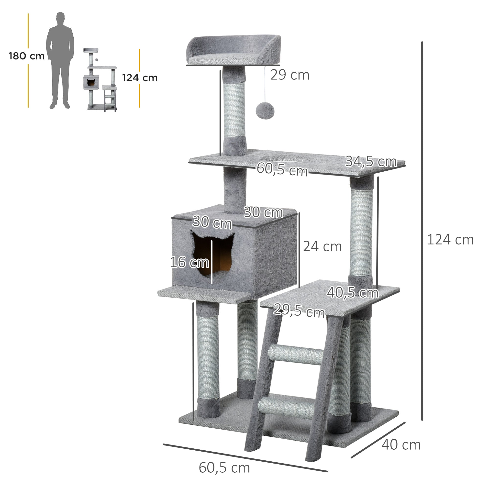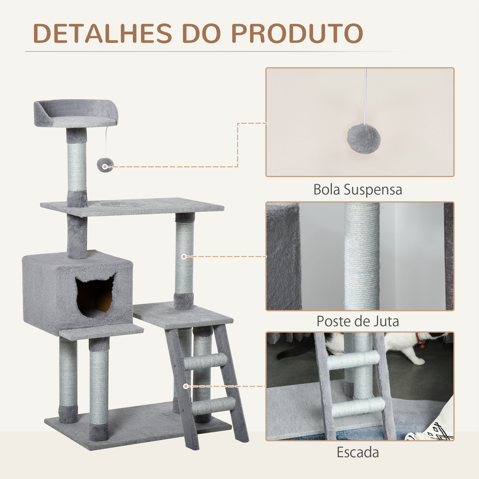 Árvore Arranhadora para Gatos Torre de Escalada com Plataformas Escada Caverna Postes de Juta e Bola Suspensa 60,5x40x124cm Cinza