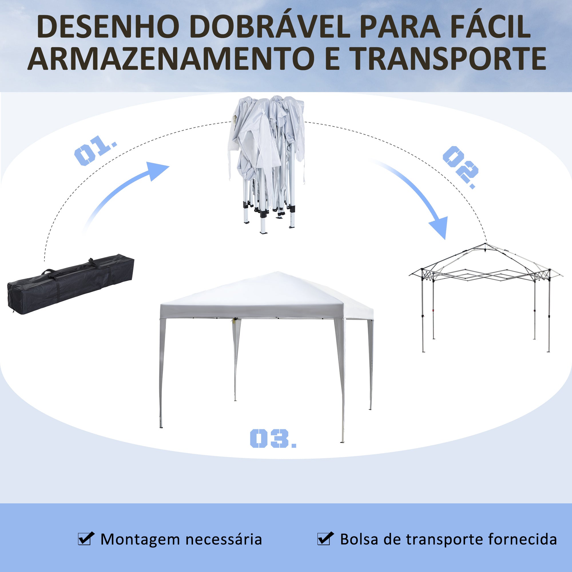 • MEDIDAS TOTAIS: 2,95x2,95x2,55 m (CxLxA). Altura do beiral: 1,93 m. Nota: Não utilizar em caso de mau tempo, ventos fortes, chuva intensa, tempestade ou neve. Utilizar sempre as estacas e cordas de fixação incluídas Trabalha com artesanato e gostaria de montar uma banca numa feira ou mercado? Precisa de uma tenda para o jardim, mas apenas para ocasiões específicas ou para a temporada de verão? Esta tenda dobrável da Outsunny é ideal para diversos usos. Feita de aço e com cobertura em tecido Oxford, resistente aos raios UV. É dobrável e vem com uma bolsa de transporte para mover e armazenar facilmente. A tenda mais funcional e versátil que se pode encontrar!