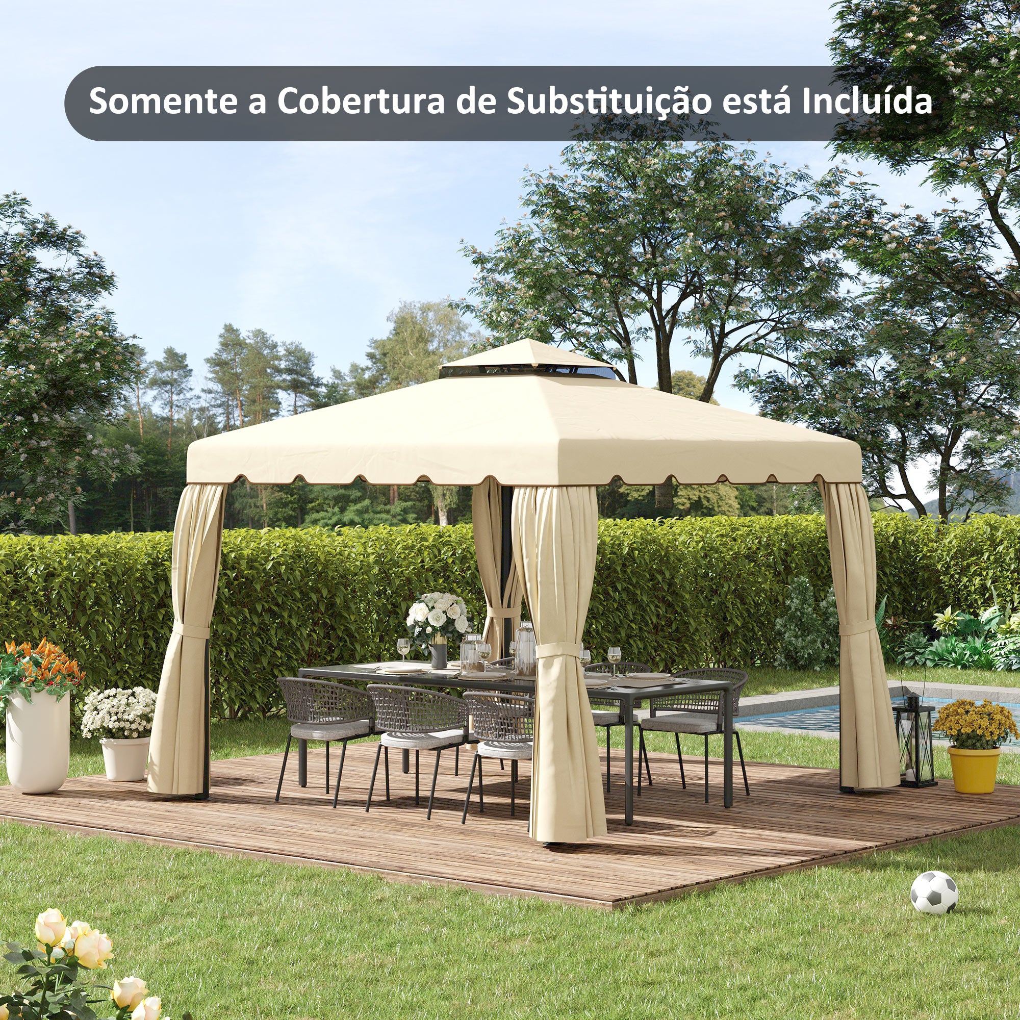 Toldo de Substituição para Pérgola 2,96x2,96m Teto de Substituição para Pérgolas Exterior com Duplo Teto e 8 Orifícios de Drenagem Bege
