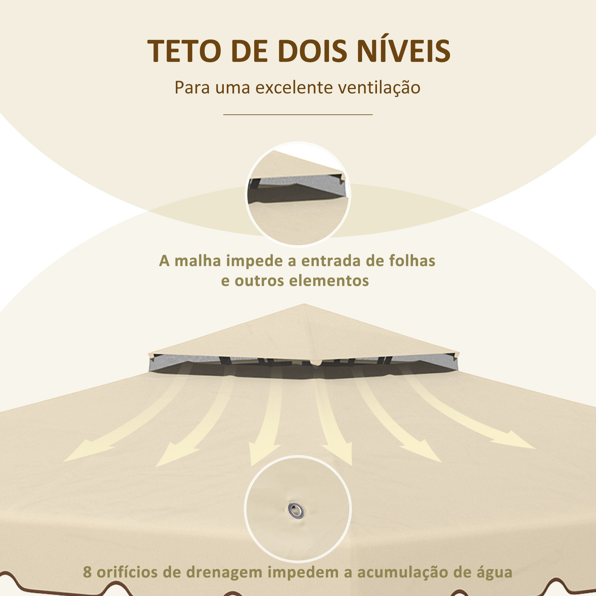 • TETO DUPLO: Com um desenho de teto de duas camadas, este toldo de substituição permite que o fluxo de ar o mantenha fresco no verão e maior resistência em dias de vento. Possui ainda 8 orifícios de drenagem que evitam o acúmulo de água