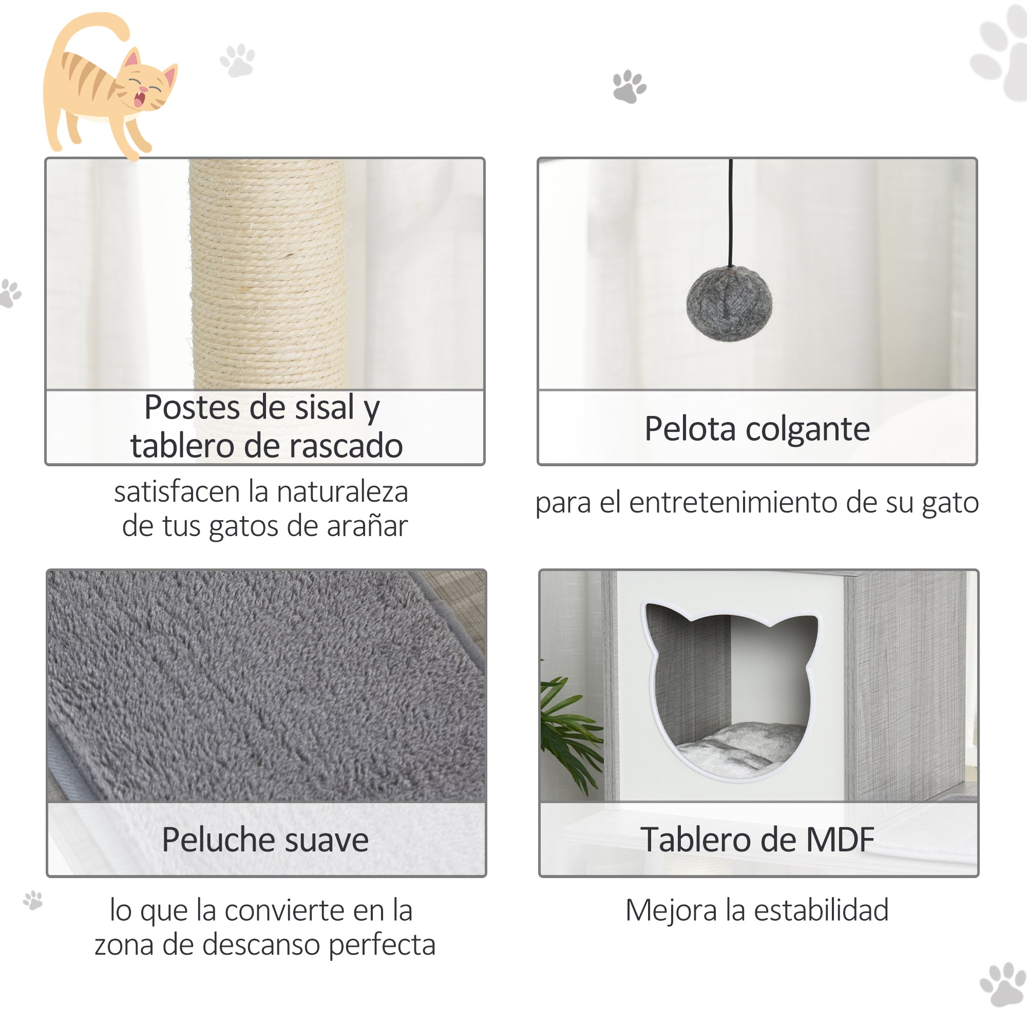 - Equipado com 1 caverna espaçosa para que seu gato possa se refugiar nela, além de ter uma rede, um brinquedo pendurado e várias superfícies