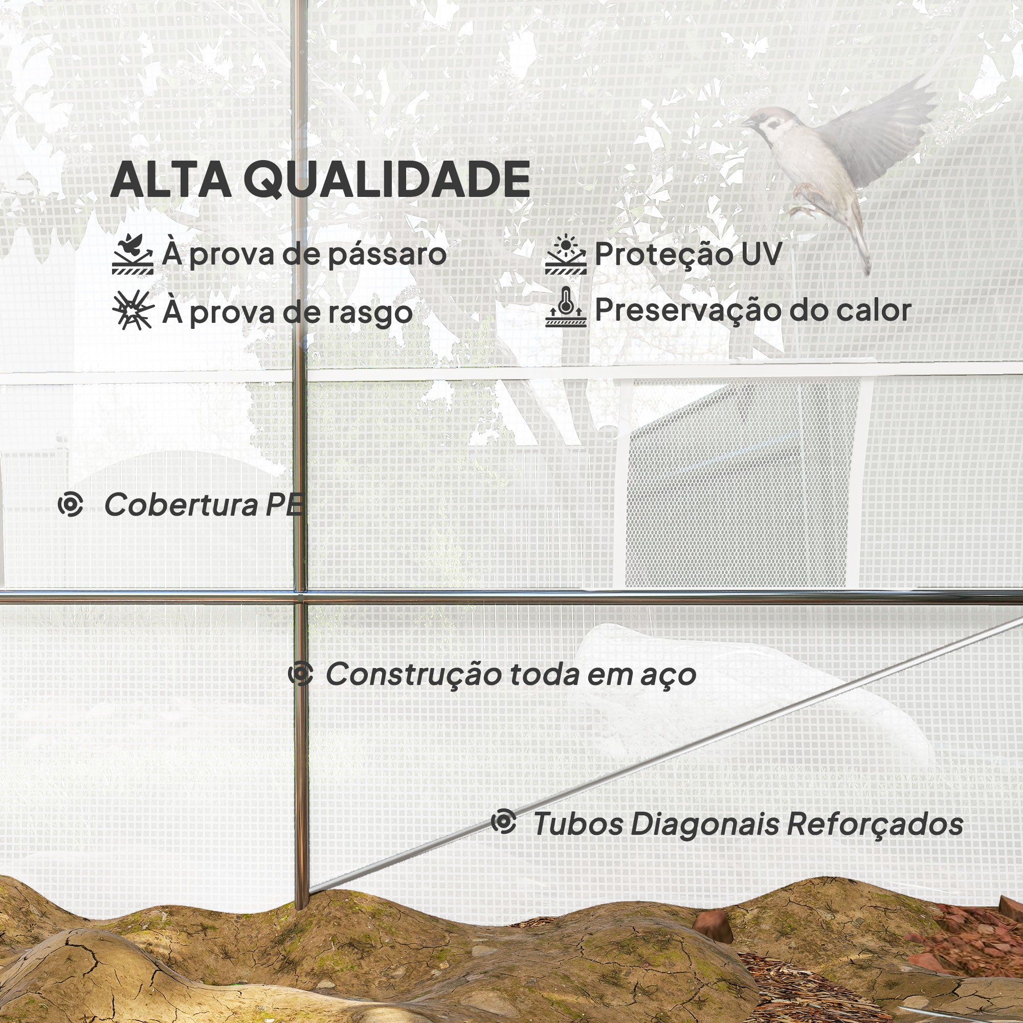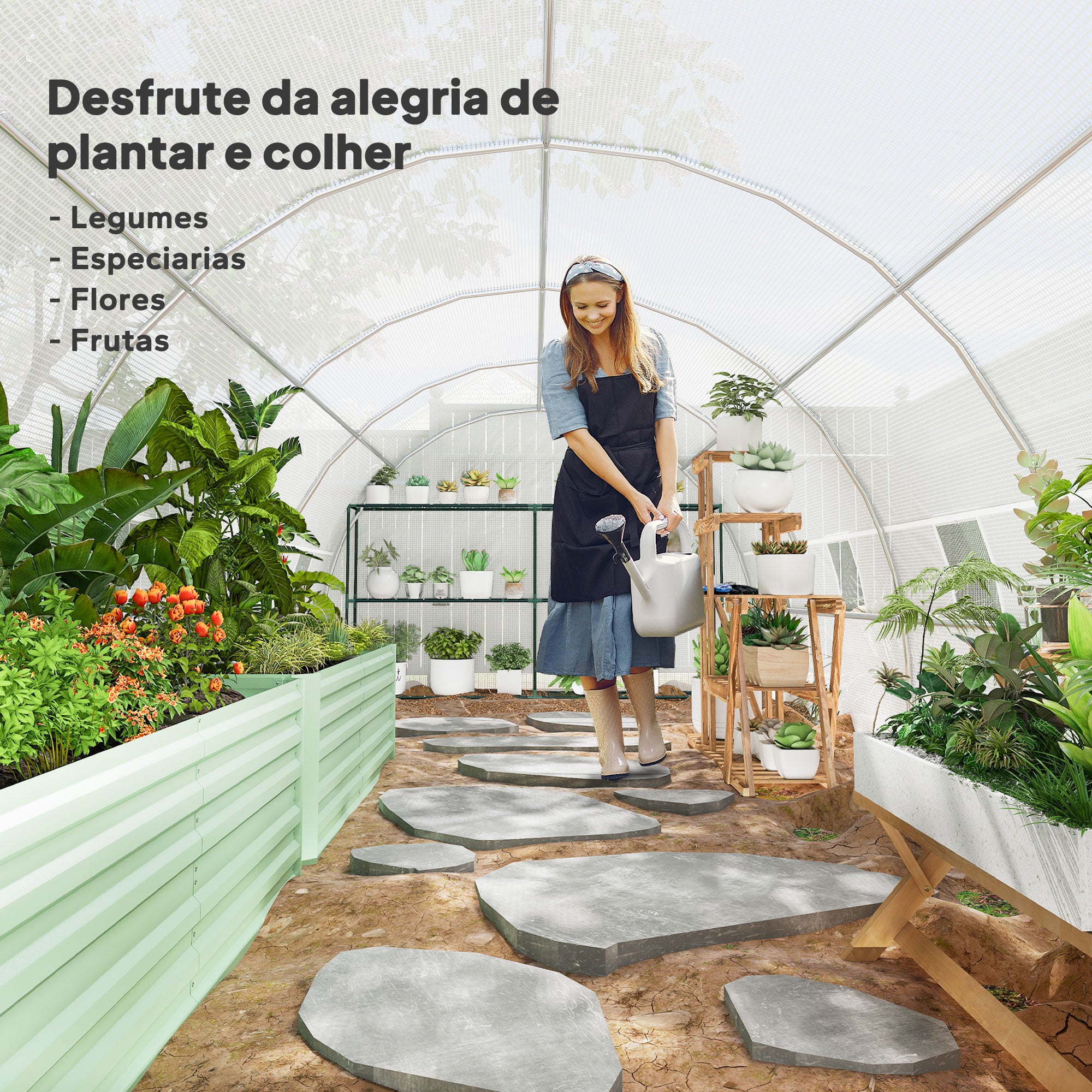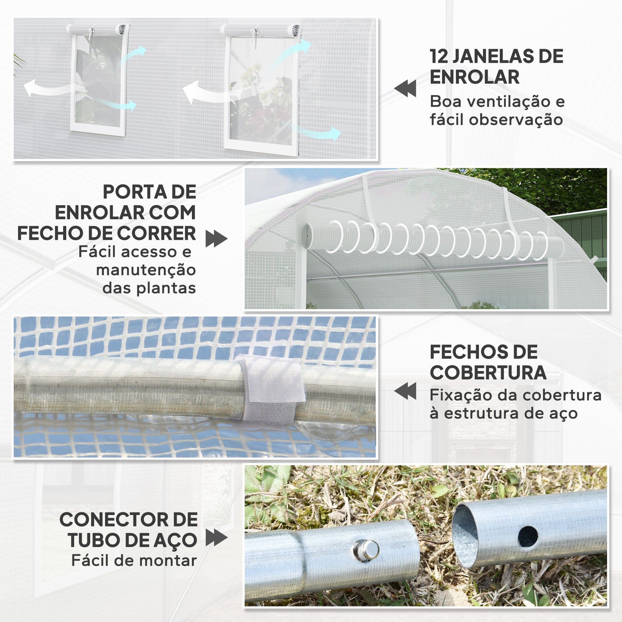 - MEDIDAS TOTAIS: 800x300x200 cm; Medidas da porta: 148x180 cm (LxA); Medidas da janela: 40x40 cm (LxA) Se procura uma estufa de grande formato, esta estufa Outsunny tem uma área de 24m2. Sua estrutura é fabricada em aço inoxidável e revestida com PE de alta qualidade, resistente às intempéries e aos raios UV. Perfeito para proteger suas plantas dos elementos externos e ajudando a mantê-las longe de pragas. Possui uma porta de enrolar com zíper para fácil acesso e janelas de 12 mesh, perfeitas para boa ventilação e para visualização externa.
